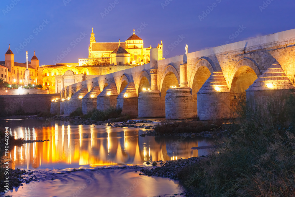 Illuminated Great Mosque Mezquita - Catedral de Cordoba with mirror reflection and Roman bridge across Guadalquivir river during evening blue hour, Cordoba, Andalusia, Spain