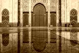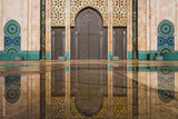 view of Hassan II mosque's big gate reflected on rain water - Casablanca - Morocco