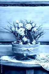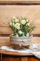 Florist at work: woman shows how to make simple Easter centerpiece with eustoma flowers, green twigs and moss in the glass stand. Step by step, tutorial.