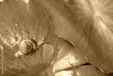 Small snail crawling on vibrant green lotus leaf with water drops,A top-down macro shot of a small brown snail moving slowly across a lush, wet green lotus leaf after rain, symbolizing slowness, natur