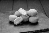 Crispy fried cheese bites with creamy filling on slate board, dark background