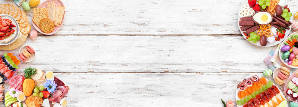 Spring or Easter grazing board theme double border against a white wood banner background. Top view. Variety of sweets and cheese, meat and fruit appetizers. Copy space.