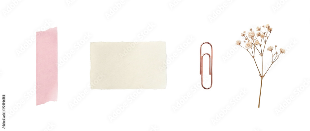 Pink washi tape strip, torn white paper note, rose gold paperclip and dried baby's breath isolated on transparent background. Minimal stationery collage elements for scrapbook and branding.