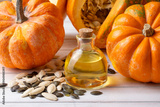 Pumpkin seed oil and fresh pumpkins.