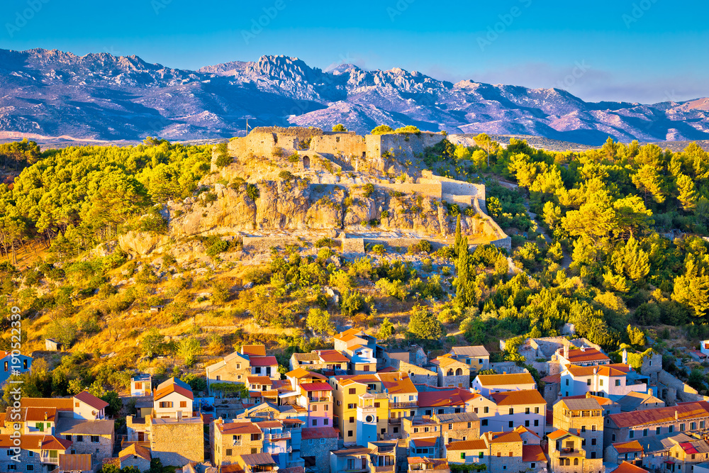 Novigrad Dalmatinski fortress and Velebit Mountain view