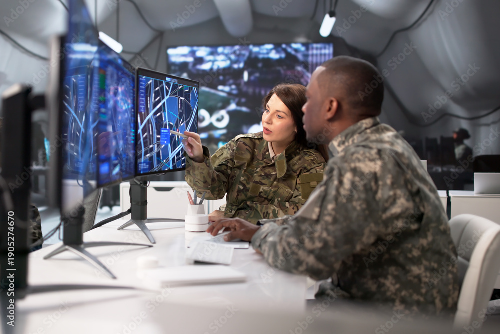 Soldiers In Military Control Center Monitor Maps On Multiple Screens