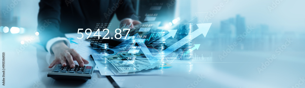 Business finance and investment concept, Businessman calculating and analyzing financial data report with business graph growth chart and world economic, Stock, Banking, Accounting.