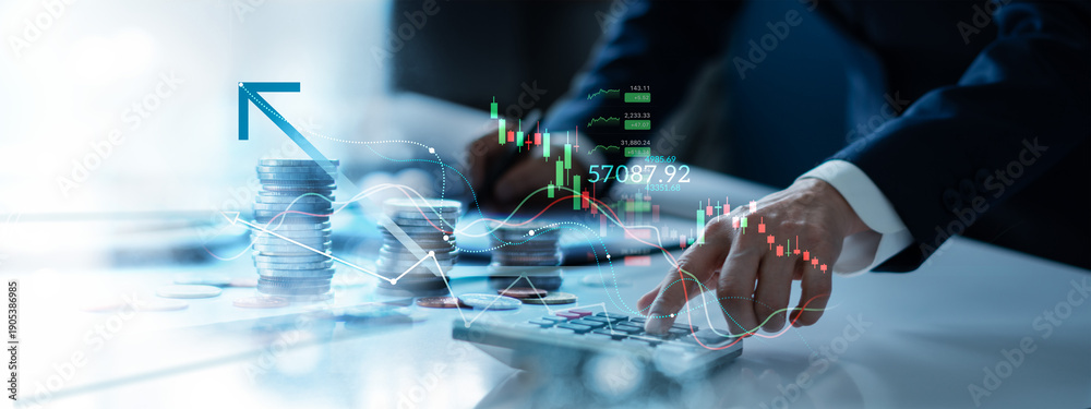 Business finance and investment concept, Stock, Banking, Accounting, Businessman calculating and analyzing financial data report with business graph growth chart and world economic.