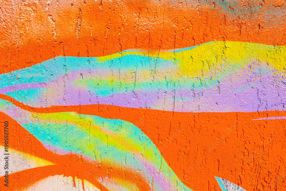 Orange textured wall with pastel rainbow gradient abstract graffiti. Y2K, 2000s style, iridescent glow, fluid paint. Poster, background, digital art, modern 90s creative banner, summer visual