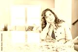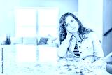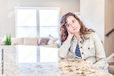 New modern faucet and kitchen room island and granite countertops in model house, home, apartment with young woman sitting at bar, thinking