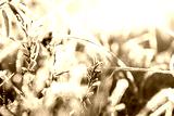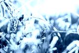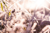 Macro colorful vintage red sunrise in autumn fall showing detail, texture and pattern with frost snow on plants in dawn in West Virginia