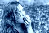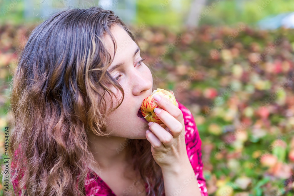 Young woman face eating one apple fallen wild fresh on grass ground bruised on apple picking farm closeup