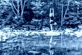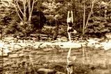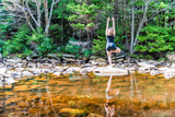 Young woman in tree yoga pose standing on one leg on rock by river in zen nature landscape meditating in Red Creek, Dolly Sods, West Virginia