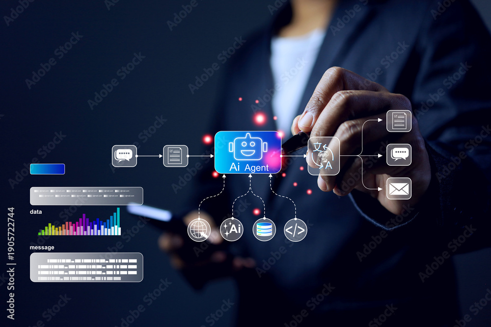 AI agent concept with a man writing line to command agentic artificial intelligence automation node coding flow process perform multi-step tasks across different software platforms independently