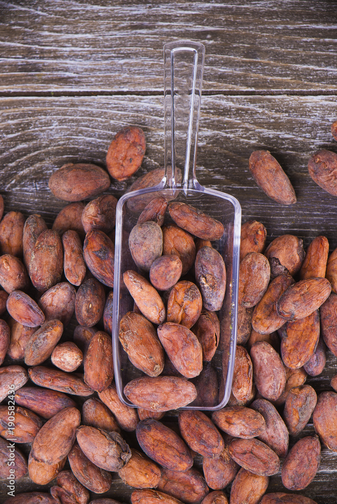 Cacao beans with scooper over wood background