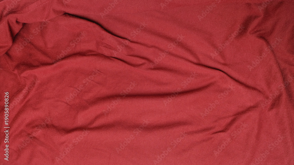 Background pattern and texture of the surface of a maroon t-shirt that is wrinkled and wrinkled. Copy space for text. For graphic design, 3D rendering and banners