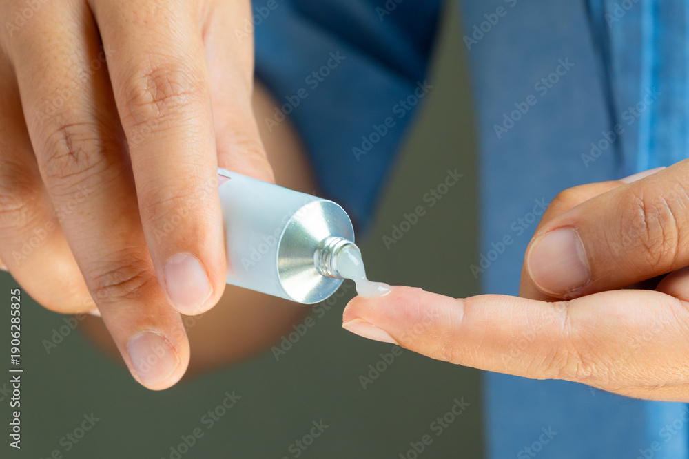 Hand of woman squeezing muscle rub cream from tube onto finger, analgesic ointment for pain relief, sports massage and physical therapy concept
