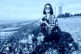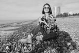 Photographer woman sits on a pebble beach with a camera, wearing a plaid shirt and boots, capturing a coastal scene under bright sun, conveying relaxed outdoor lifestyle and creative travel moments