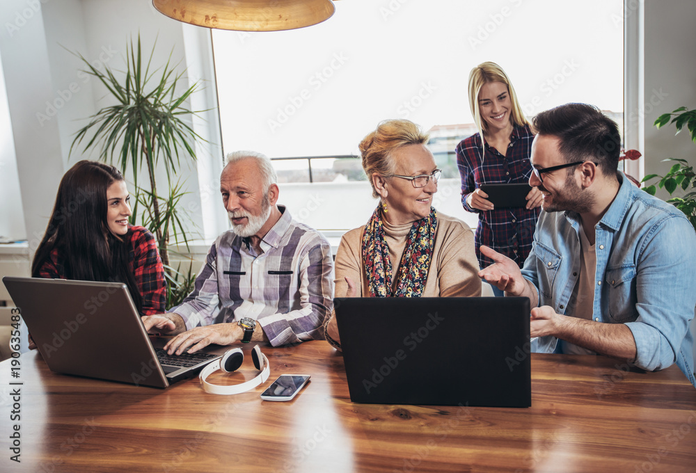 Young volunteers help senior people on the computer. Young people giving senior people introduction to internet