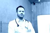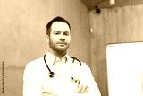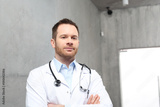 Lekarz. Przystojny lekarz ubrany w biały kitel stoi w klinice