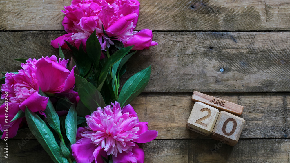 Pink peony flowers with green leaves decorating a rustic wooden background, featuring wooden block calendar displaying the date June 20, symbolizing summer and special occasions