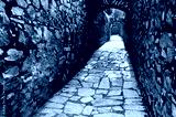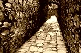 Narrow stone passage with arched openings and rough masonry walls inside a historic fortress.