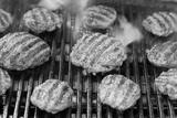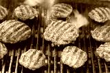 Burger patties grilling with fire and smoke