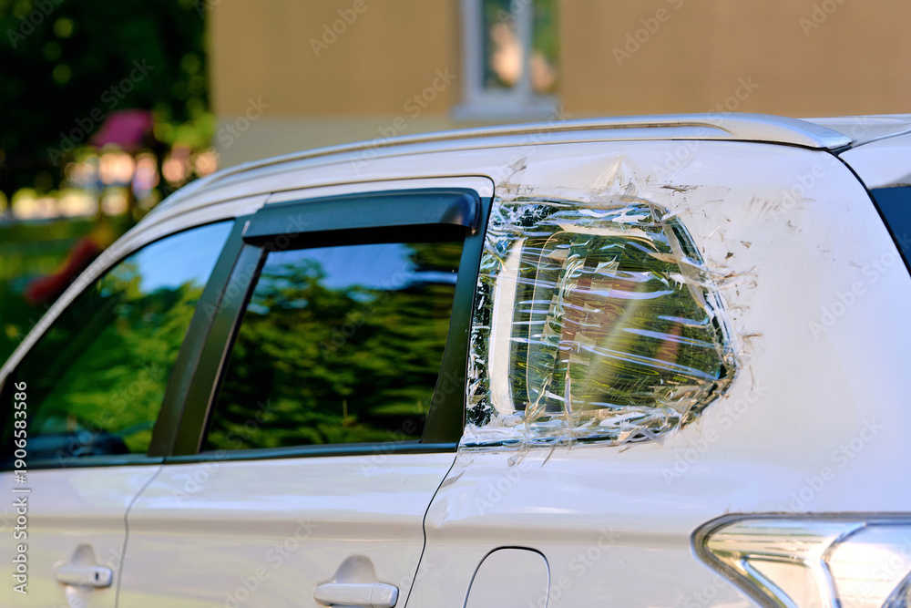 Damaged vehicle rear window. White car with broken rear quarter window that has been temporarily fixed using layers of clear adhesive tape, plastic film following an accident or vandalism. Diy repair