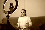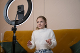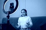 Young female blogger talking on smartphone under ring lamp, recording home vlog to share daily life, lessons and stories with her online audience