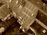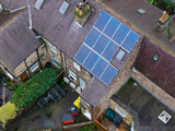 Aerial drone photo taken in the town of Wetherby in the City of Leeds in Yorkshire England showing an old victorian house with energy saving solar panels on the roof of the property in the winter time