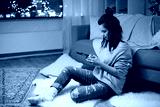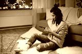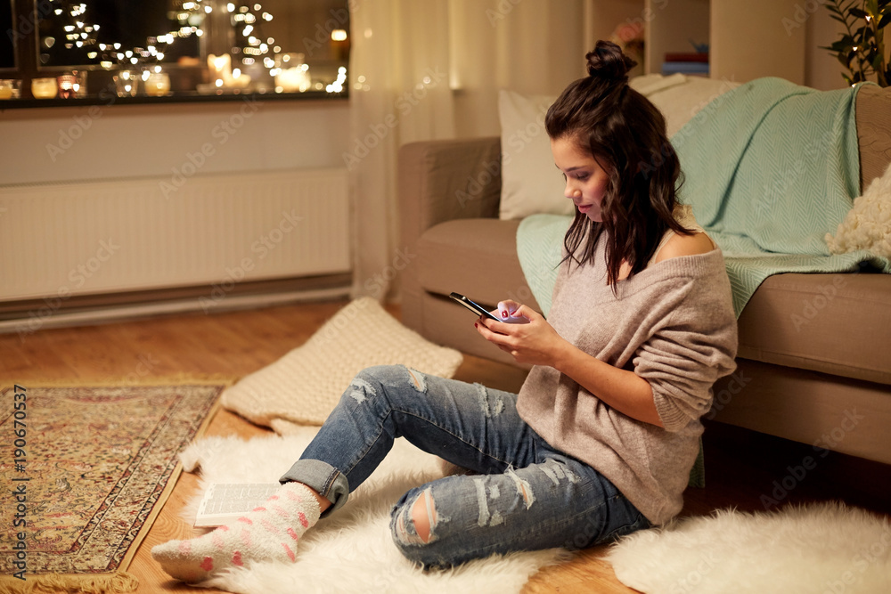 happy young woman with smartphone at home