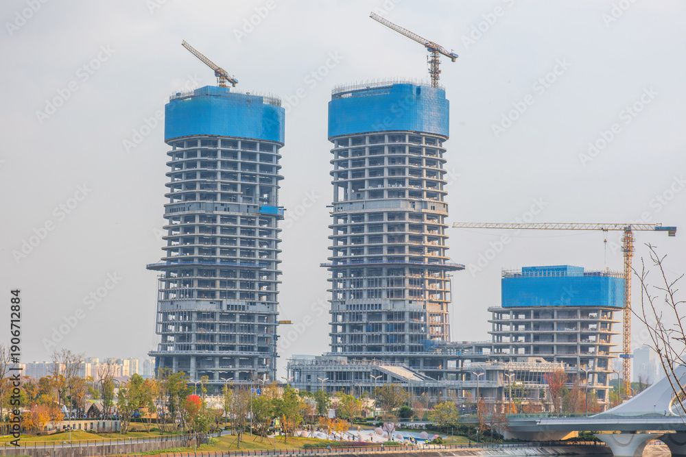 Modern high rise buildings under construction with tower cranes rising above urban park in Chengdu city, Sichuan province, China. Construction and engineering industry. Urban development and growth