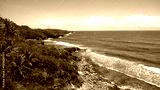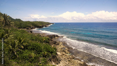 Rocky beach with palm trees, blue water on a tropical island. Sea rocky coast, waves breaking to the rocky shore. Viewpoint along stony beach with rocks.Stony sea beach scene. Philippines. Travel