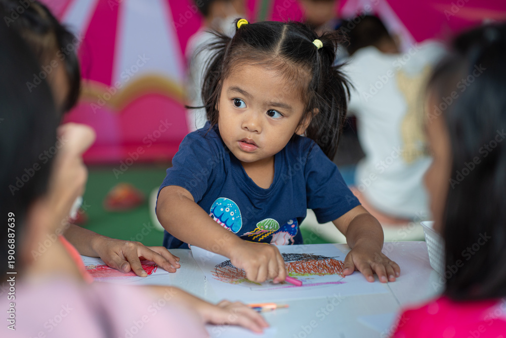 Adorable little asian preschool girl enjoy drawing pencil color paint on paper