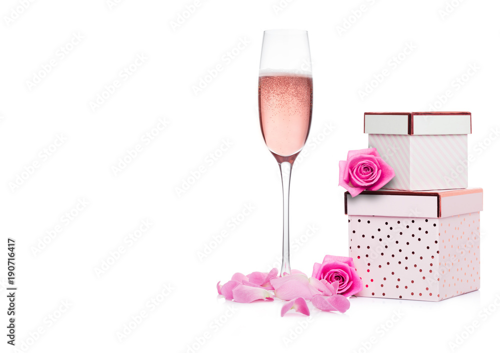 Glass of pink champagne with pink gift box