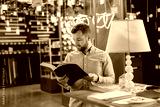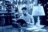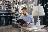 Man shopping for home lighting, reading product catalog in a showroom, choosing new lamps for interior design