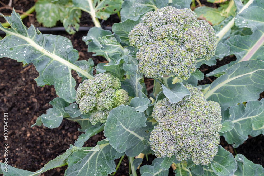 Broccoli plants grow in a garden bed with green leaves and healthy florets during daytime hours in a sunny location