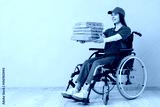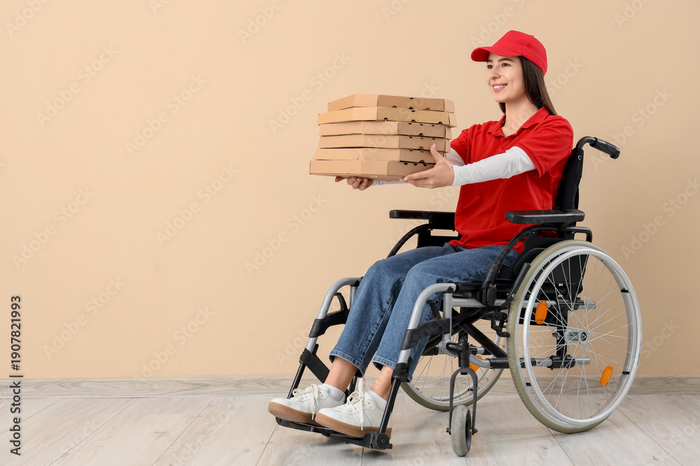 Young female courier with pizza boxes in wheelchair on beige background. Equality concept