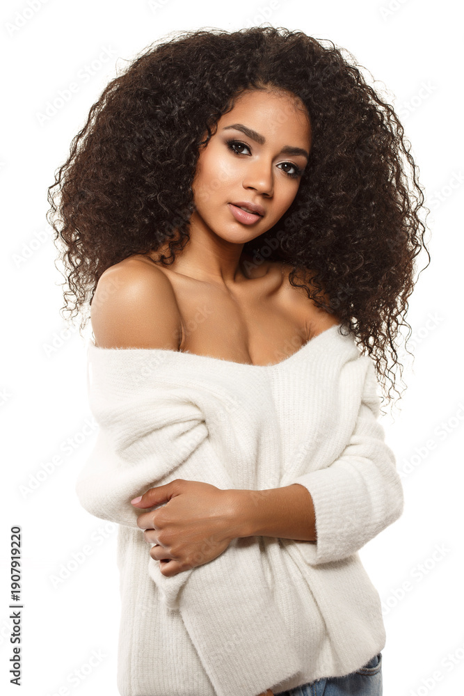 Beauty black skin woman African Ethnic female face. A woman with curly hair stands against a plain background while wearing a white sweater.