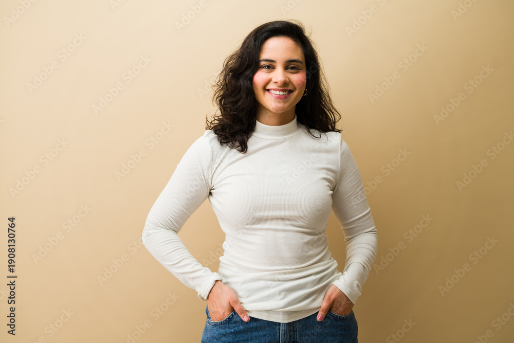 Happy young woman smiling, feeling confident and successful, standing against a beige background, with copy space
