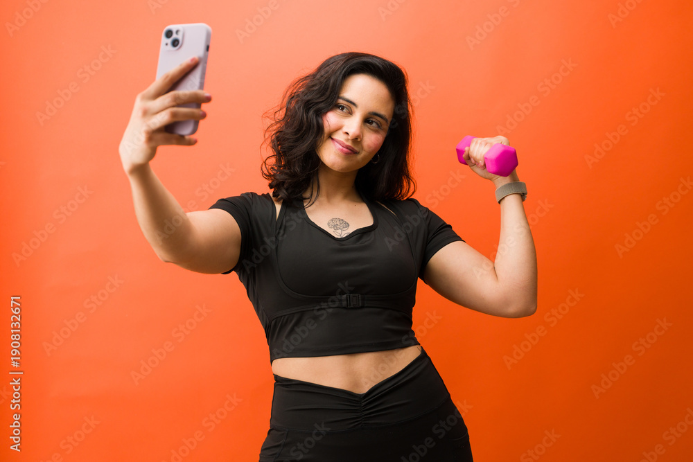Fitness influencer woman taking selfie with smartphone and dumbbell, showing arm muscle in workout studio