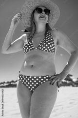 Beautiful middle-aged woman sunbather in bikini and straw hat walking on sandy beach in summertime. Front view
