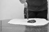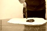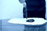 Woman put a sweet jam on dough for strudel. Making fresh domestic cookies
