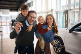 Cheerful family having fun while buying new car in auto salon and looking at camera.