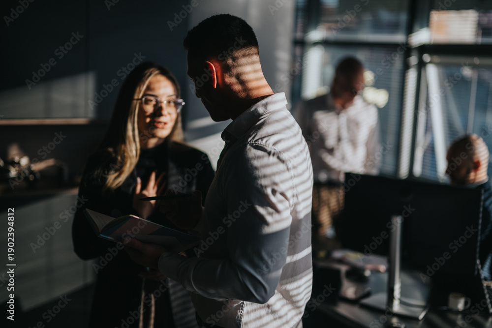A vertical soft beige background hosts pink tulips white tulips gypsophila and speckled eggs arranged along the left edge
