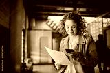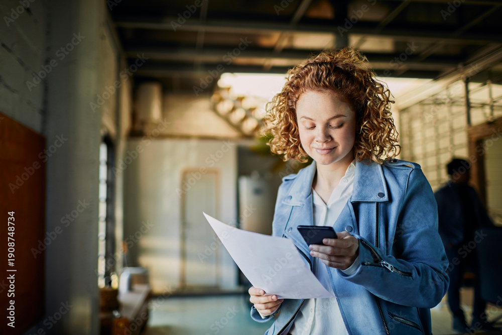 Young businesswoman reading document on smartphone in modern office