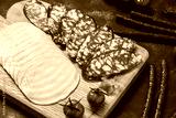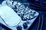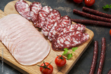 Various sausages chopped on a cutting board, ham, hunting sausages, salami, cherry tomatoes. Selective focus