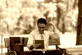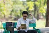 Young businessman looking at digital tablet in the park. He showing signs of rejoicing at their success. A successful businessman concept