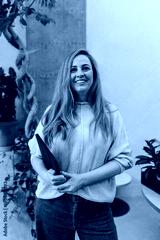 Confident businesswoman in a yellow sweater at a Madrid coworking space, smiling with folder