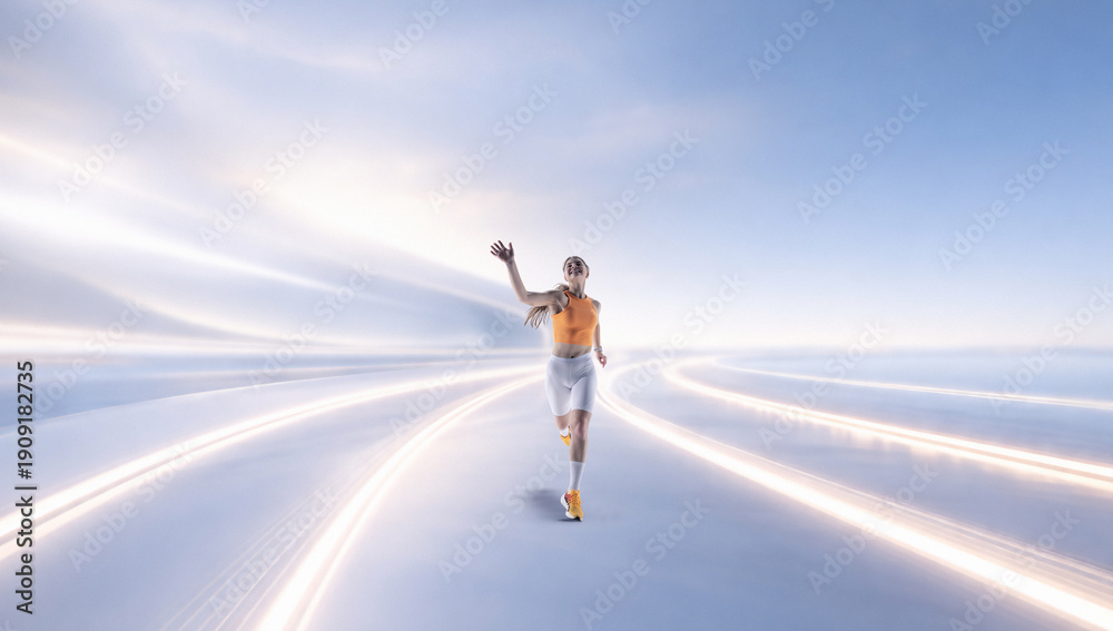 Dynamic sports artwork of female runner sprinting through light trails. Concept of endurance training, fitness motivation, performance mindset, wellness advertising, active lifestyle branding.